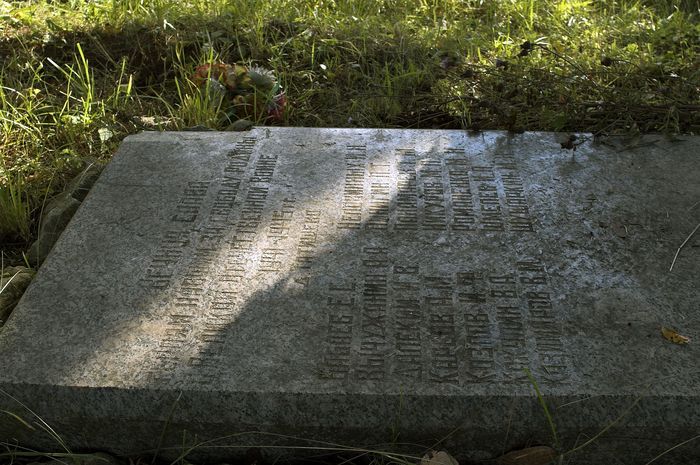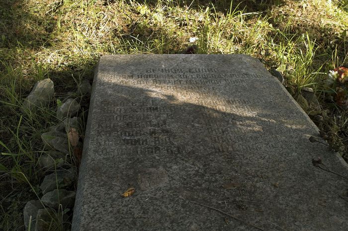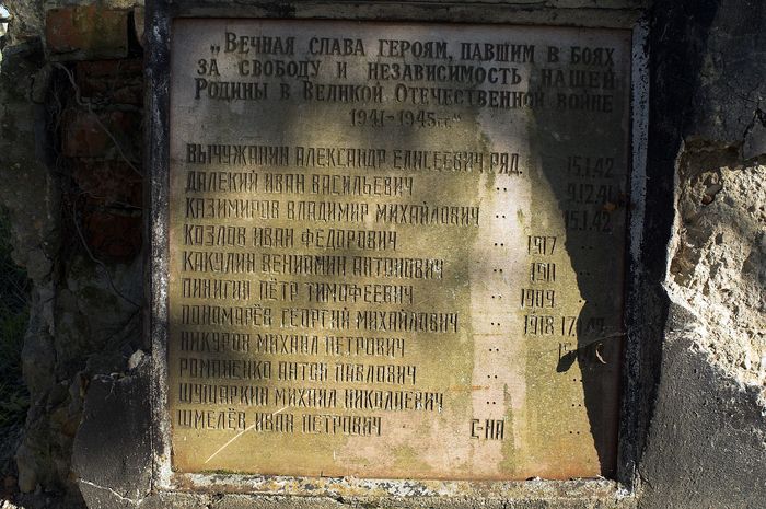 Чуть ниже валов - еще один, без табличек. Похоже, вандалы пытались его сковырнуть, но не смогли. Памятник стоит на постаменте наискосок и укреплен цементом: