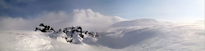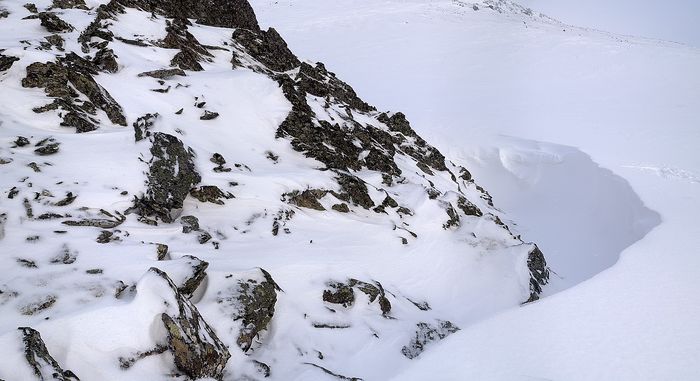 Занесенная снегом скала на переходе от ручья Елец к подножью Степ-Рузи.